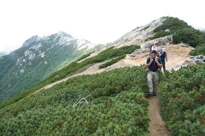 | 為右衛門吊岩付近を通過する。 | 野口五郎岳を背に尾根を行く。 |