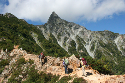 | 青空の下、赤岩岳をトラバースする。 | トラバース道には、岩場もある。 |