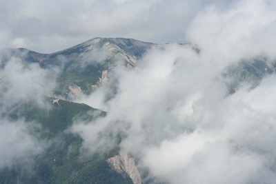 | テントを撤収し、下山にかかる。 | 下に下りてくると雲の下に出た。 |