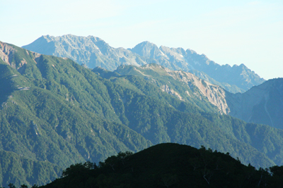 | 燕岳(中央)と餓鬼岳(左端) | 赤茶けた岩肌が特徴的な大天井岳 |