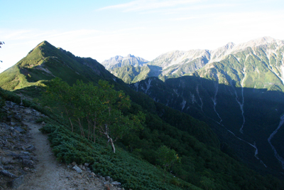 | 2日目の朝、大天井岳と牛首展望台を背に 山腹をトラバースする。 |