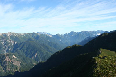 | 野口五郎岳(左端)、立山、剣岳、針木岳、白馬岳、 鹿島槍ヶ岳(右端) |